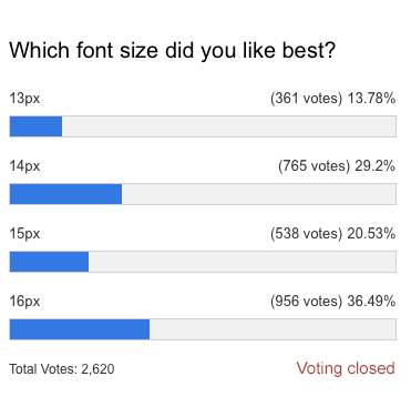 What’s a good size to use for the body text of your website? A recent Smashing Magazine article makes a case for using fonts sized 16px or larger, and others have proposed this before. This is the default 100% browser font size, though it’s rarely used. But rather than theorize, let’s do a poll and find out what size people like best. I’m focusing on 4 sizes here: 13px to 16px as I think this covers body text well.