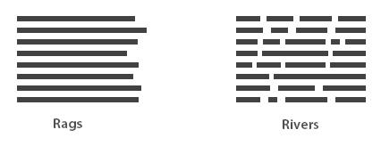 Well, there is one reason to do it, and that’s to have a nice block of even text on the page, but this is only applicable when this even block of text can actually be achieved. Stretching words to fill the whole line isn’t it. Here’s an illustration of the two approaches, rags on the left for left aligned text, and white rivers on the right in the case of improperly justified text: